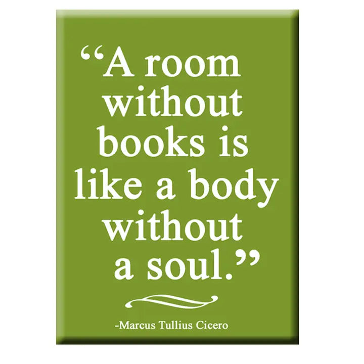 A room without books is like a body without a soul"- Marcus Tullius Cicero fridge magnet Our fun fridge magnets are made with a rigid metal material with a clear mylar protective U/V covering, so the magnet will never fade in color. A large super strong flat magnet is on the backside, to hold multiple pieces of paper to any metal surface. Dimensions: 3" x 2"