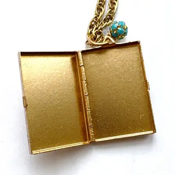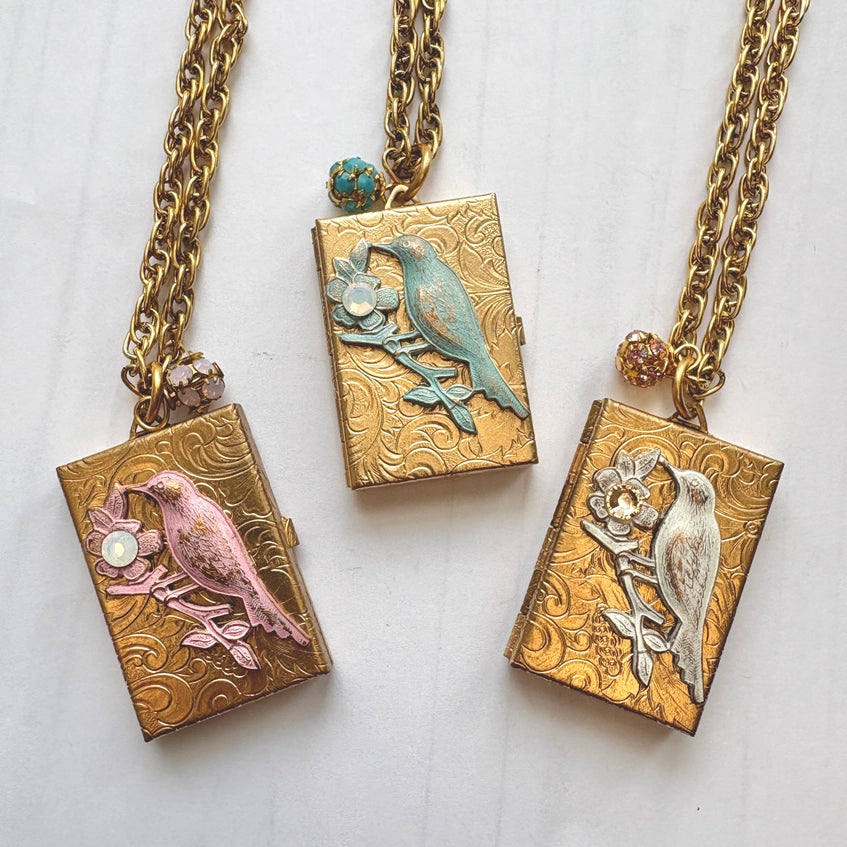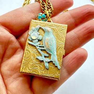 Classic and timeless bird photo locket necklace with Swarovski rhinestone bead hung on exquisite gold plated chain. Vintage-inspired replica from the Victorian era of lockets. This etched book locket opens to hold small two photographs of loved ones that you want to keep near to your heart. This is a piece that will be cherished forever. Size of locket: 1"W x 1.75"H Necklace Length: 28"