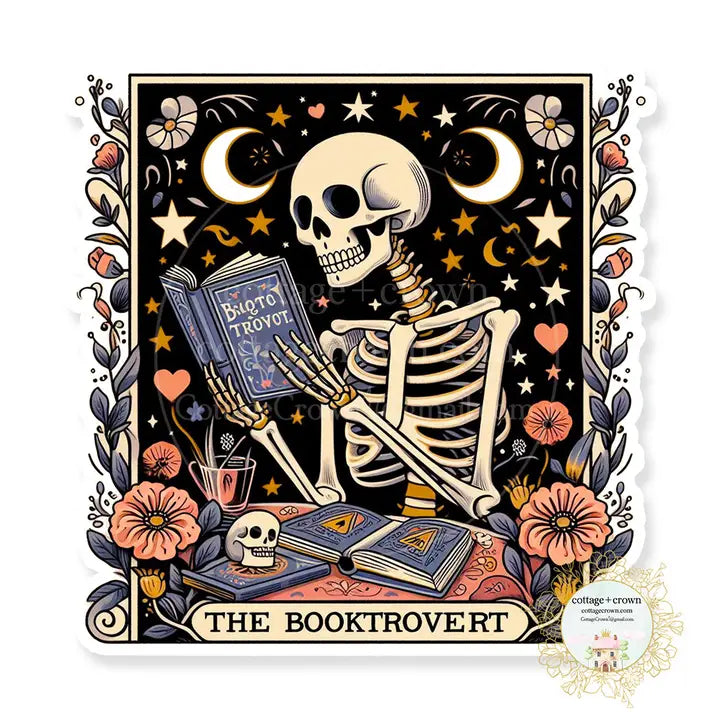 Book Tarot Card Booktrovert Skeleton Vinyl Decal Sticker My custom stickers have richly colored inks on premium, durable, velvety matte finish vinyl. They are waterproof & dishwasher safe, are UV protected, scratch resistant and can be used both indoors & outdoors. Each sticker measures 3" on its longest side. Add them into or use instead of greeting cards for a fun surprise or use these stickers on: Laptops, car windows + bumpers, water bottles, binders, lockers, musical instruments and their cases, mirrors, windows and more! Any hard surface will do!