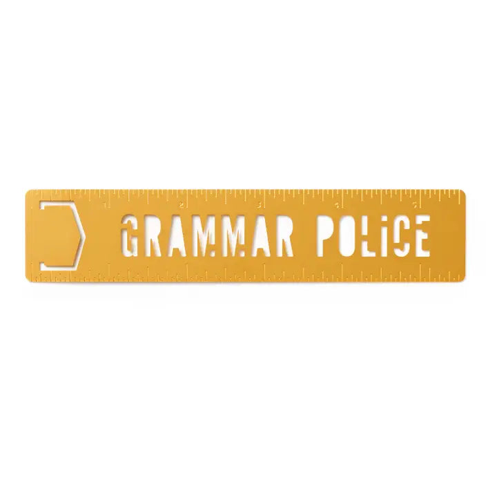 his matte gold-plated bookmark is perfect for marking your place–and leaving your mark. When it's not keeping your spot in that great American novel you're reading, you can stencil 'Grammar Police' wherever you see fit (except in those library books, you literary badass). Bonus: there's also a 5.5" long ruler etched into the surface, so you'll always know if nearby hedgehogs are tall enough to ride any rodent-based theme park rides. • Made in heavyweight metal, with a matte gold-plated finish. • Features a unique, stencil-able editorial phrase. • Includes a 5.5" ruler to, like, measure stuff with. • The bookmark measures 1.2" wide by 5.675" tall–that's 30mm by 144mm if you're fancy. • Comes beautifully packaged (at least we think so) on a 2.5" by 7.5" peggable stuffer card.