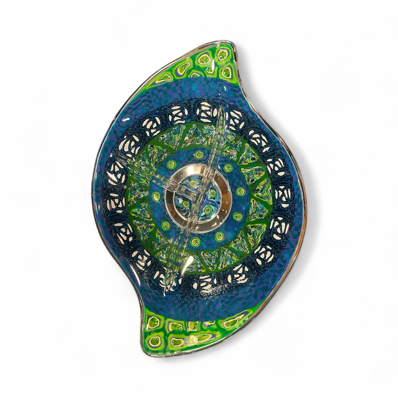 Created by artist Barbara Levy, this exquisite glass relish tray elevates functional design into fine art. Each surface is meticulously adorned with hand-sculpted polymer clay, forming a vibrant interplay of color, texture, and pattern. The result is a striking fusion of glass and sculptural detail—both contemporary and timeless.