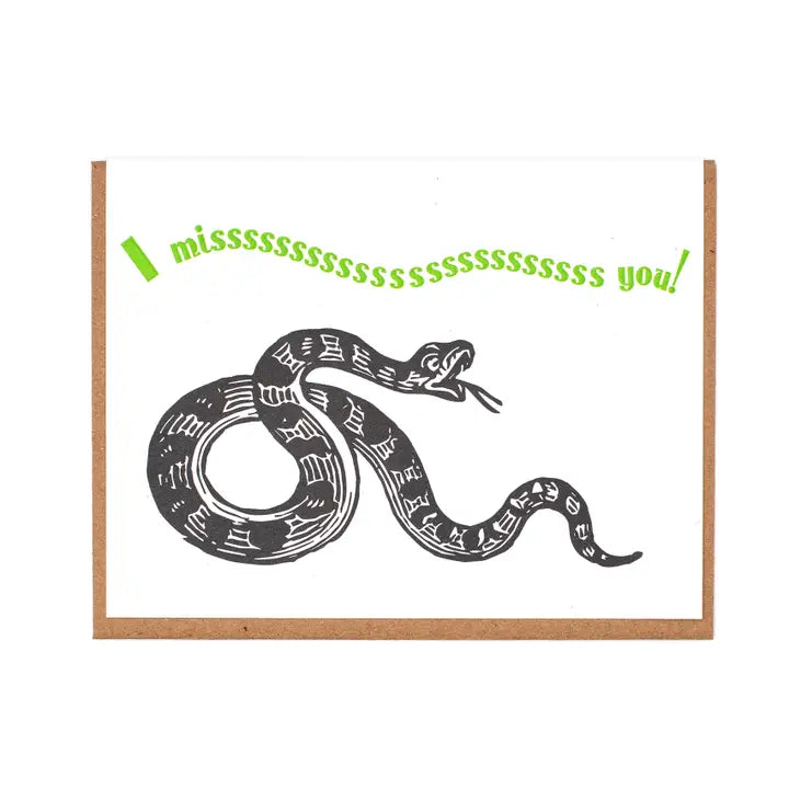 Snakes are cute, sending a card to let someone know you miss them is cute. Be cute and send this card! Letterpress printed on recycled French paper. 4.25" x 5.5" Bagged in a biodegradable sleeve. Blank inside.