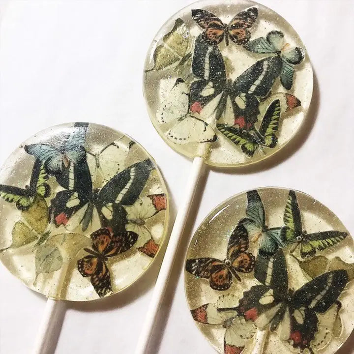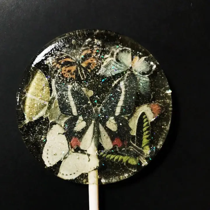 A Kaleidoscope of printed edible wafer paper butterflies flutter in a swirl of edible glitter. The lollipops are just under 3". These are magic!