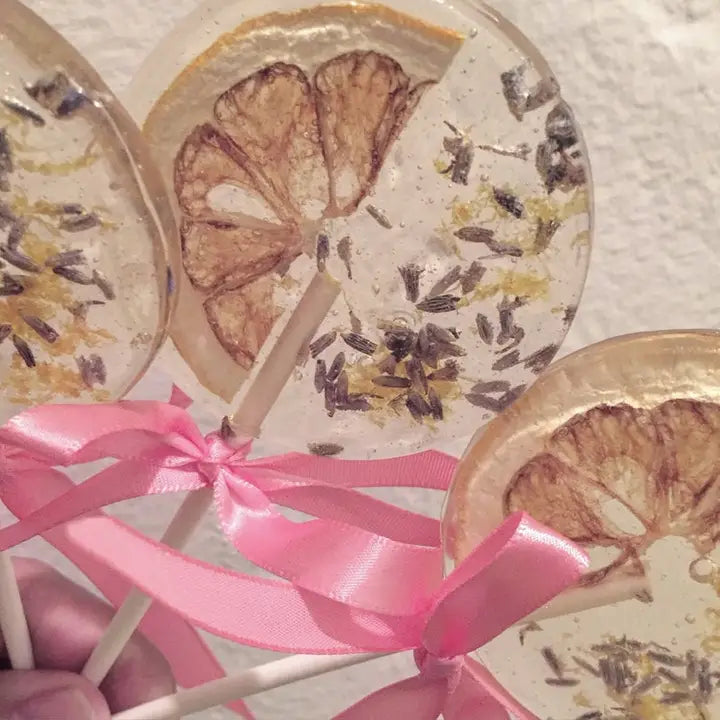 Dried lemon slices, dried lavender flowers, and lemon peel compliment these refreshing beauties. These are wildly popular! Each lollipop is individually wrapped, branded, and tied with a satin bow. The lollipops are just under 3".