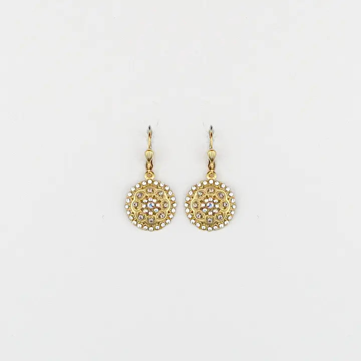 These lace-like filigree earrings dazzle with layers of intricate embellishment, each detail adorned with handset European crystals. Finished in luminous 14k gold, they radiate vintage-inspired elegance with a modern touch."