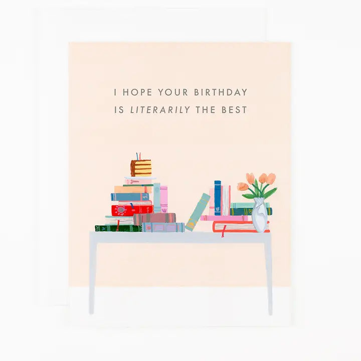 A hand painted desk with stacks of books and birthday cake text reads “I Hope Your Birthday is Literarily the Best”