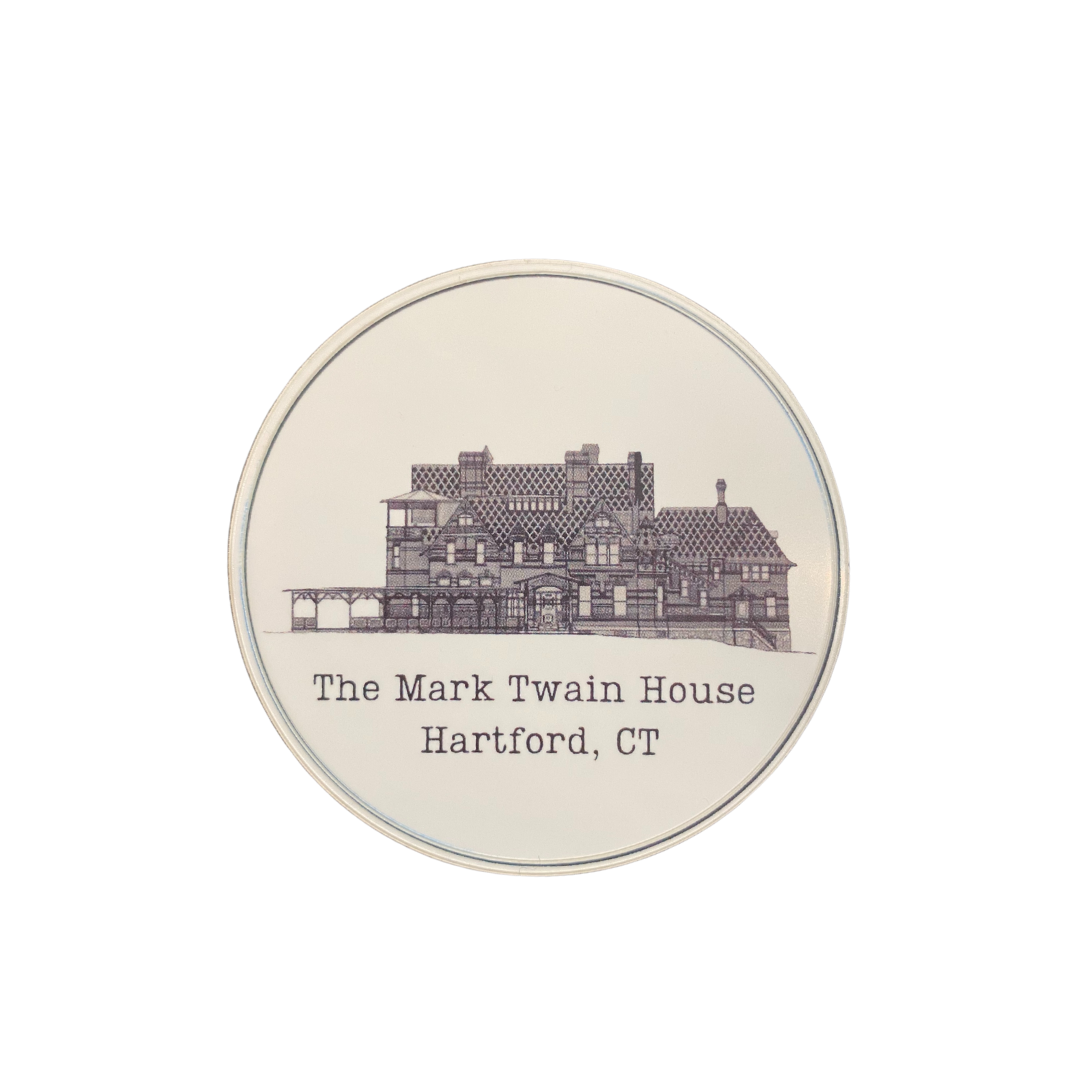 Add some flair to your laptop or water bottle with a waterproof sticker featuring an architectural design of the eastern facade of the Mark Twain House. Enjoy in green, red, or classic black and white, or silver holographic.