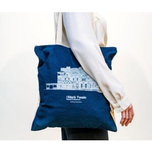 This convertible tote bag features an architectural rendering of Mark Twain's Hartford home. The canvas bag zips up so you can feel secure whether you are carrying it over your shoulder, or on your back.