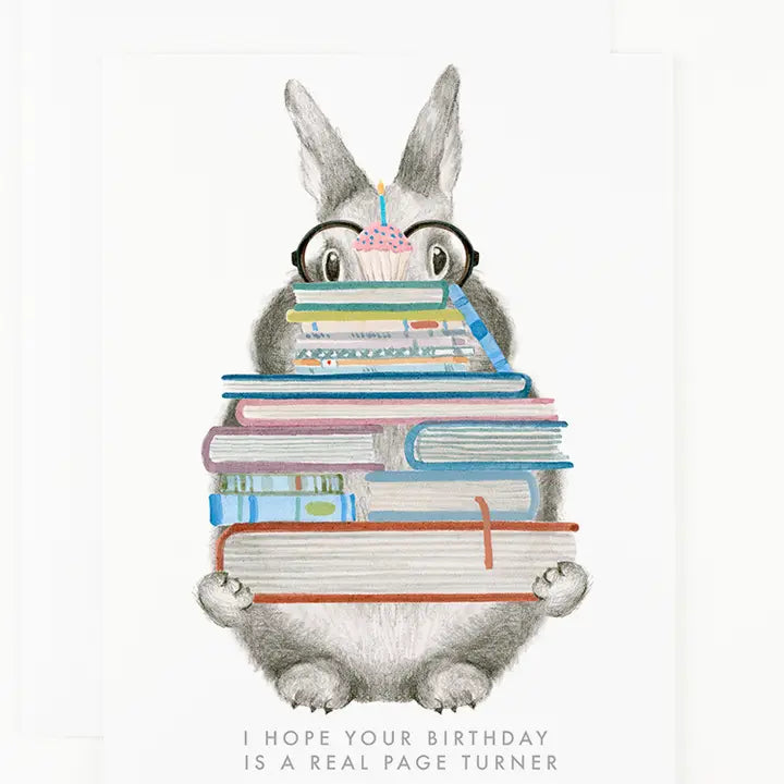 A hand drawn bunny in graphite carrying hand painted books text reads "I hope your birthday is a real page turner". Blank inside.