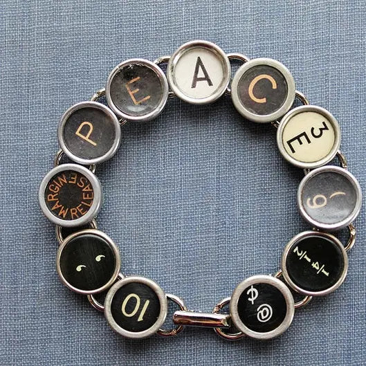 Typewriter key bracelet featuring the word PEACE Each finished piece is a unique work of art and makes a great gift or something special for yourself. Because real vintage typewriter keys are used, the appearance may vary, and keys may show signs of use/wear, adding character to every bracelet. Your bracelet will vary from picture shown.