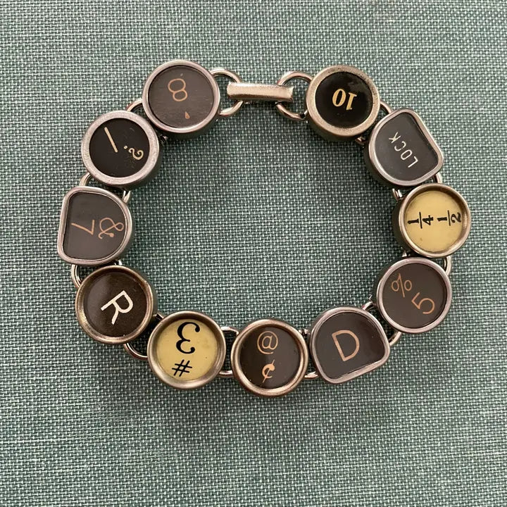Typewriter key bracelet featuring the word READ Each finished piece is a unique work of art and makes a great gift or something special for yourself. Because real vintage typewriter keys are used, the appearance may vary, and keys may show signs of use/wear, adding character to every bracelet. Your bracelet will vary from picture shown.