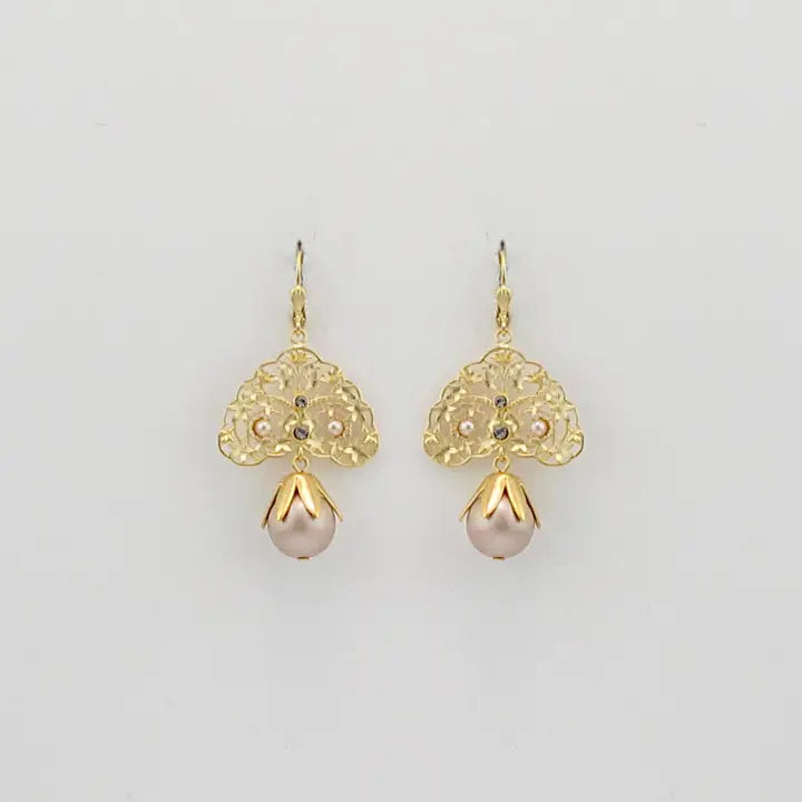 Gracefully detailed filigree shimmers with delicate botanical motifs, finished with a soft blush Swarovski pearl drop for a touch of timeless romance. Luxuriously gold-plated, this piece captures elegance that transitions seamlessly from day to evening.
