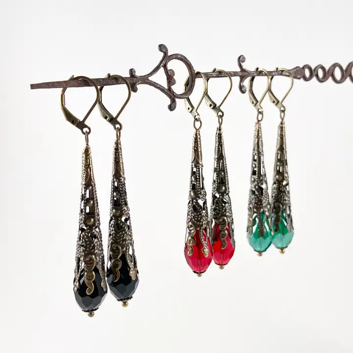 Leverback earwires and ball headpins give these earrings a more classic Victorian/vintage look. These Victorian styled earrings are made of highly detailed filigree wrapped around a teardrop shaped faceted glass bead in assorted jewel toned colors. A tiny filigree cap is added to the end and it is finished in antique bronze. The hollow filigree makes these fairly lightweight on the ear. Earrings are ~1/2" wide • 2” long • Nickel free