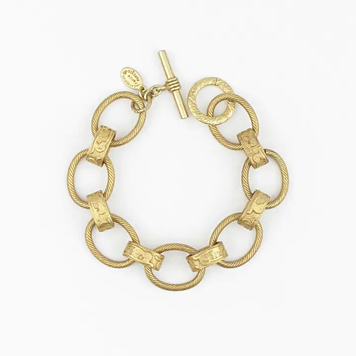 “Crafted with embossed links and plated in radiant gold, this bracelet exudes timeless elegance. Substantial yet refined, it makes a striking statement worn alone or adds sophistication to a layered stack.”