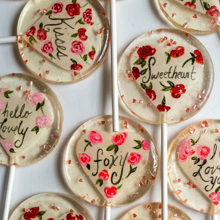 Hand painted wafer paper floral hearts with sweet little Valentines Day/Love greetings. You are able to customize these. The candy has floating edible pink glitter hearts.Each lollipop is individually wrapped, branded, and tied with a satin bow. The lollipops are just under 3".